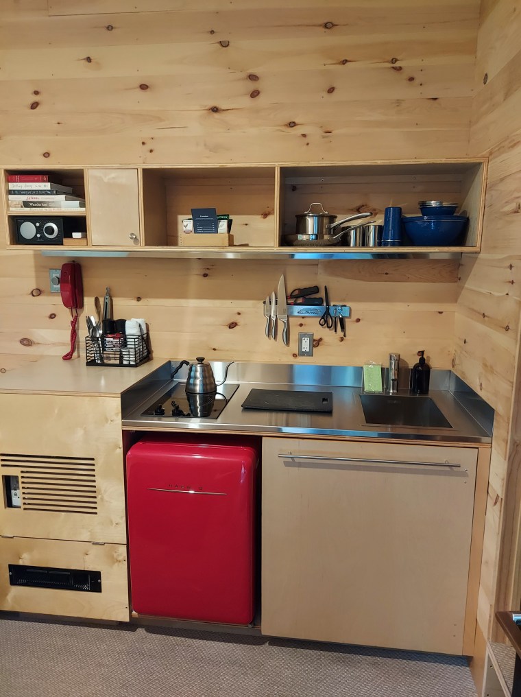 The Getaway House has firewood and some other basic items for sale all under $10. Yes there’s a stove and cookware is provided. Yes there is a mini refrigerator and a bathroom just to clear up some questions. Each vacation rental is 75 foot away from the next rental so privacy isn’t a concern.