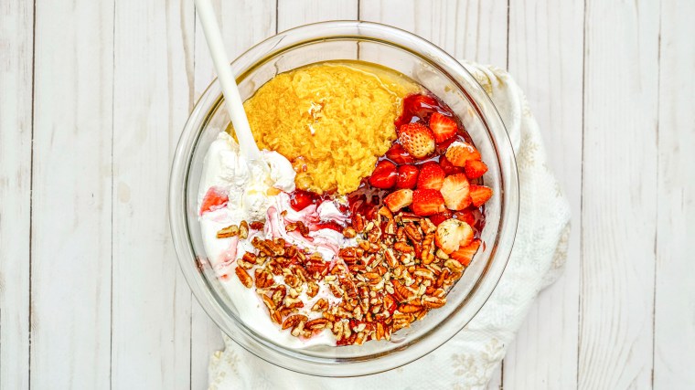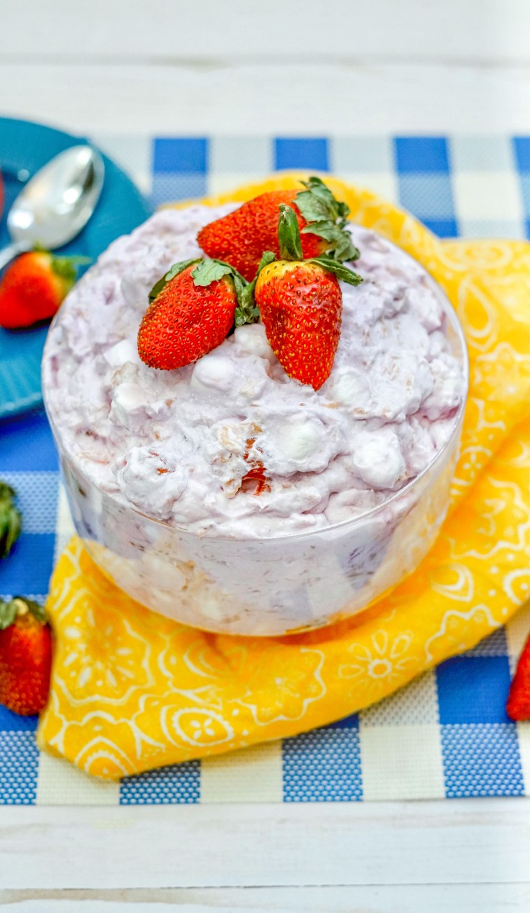 In a large mixing bowl combine all ingredients besides the garnish strawberries.