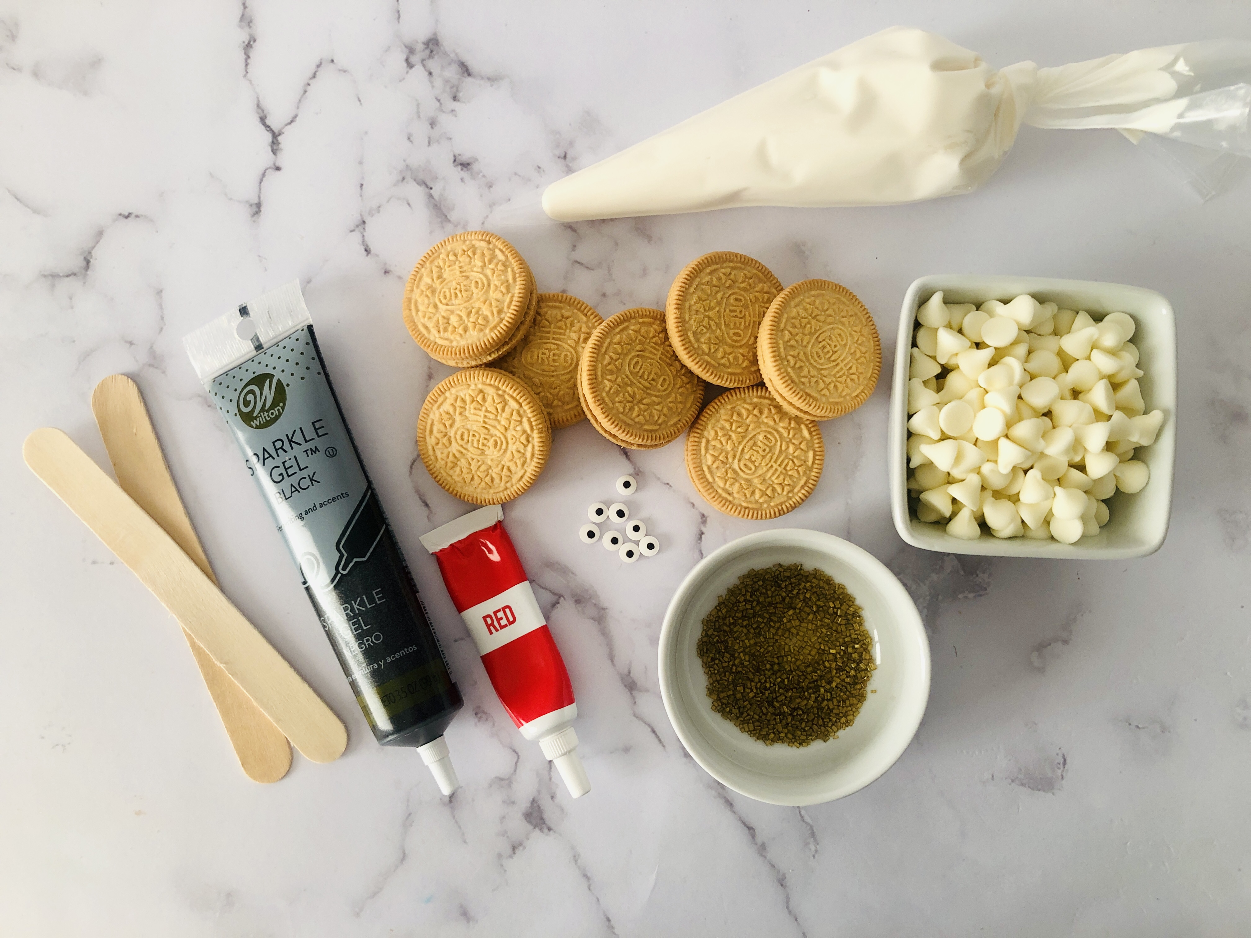 Pipe the fur trim on the middle cookie as shown then use the black gel to make the belt and the gold sprinkles to serve as the buckle