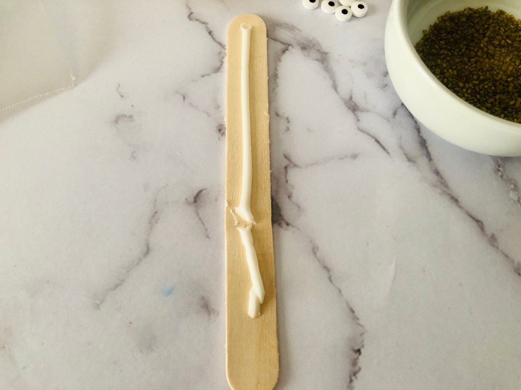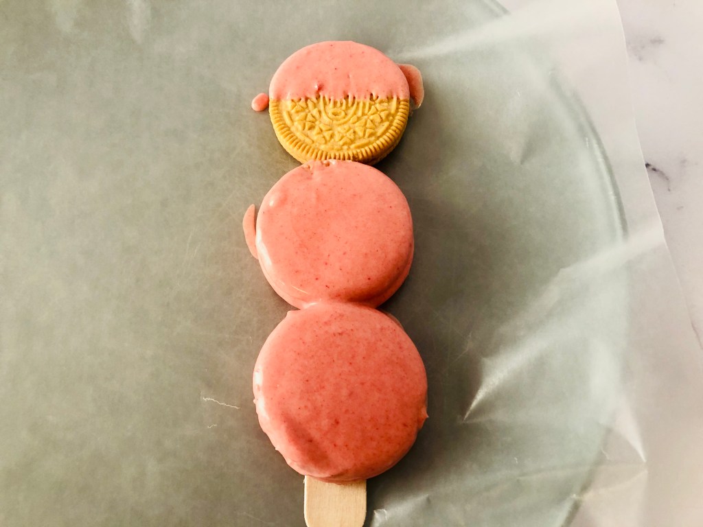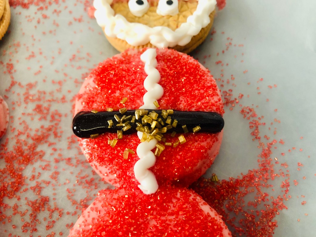 Dip 2 cookies fully and ¼ of one cookie for each Santa and lay them in a vertical line on a wax paper lined plate or on a jumbo craft stick for stability (optional)