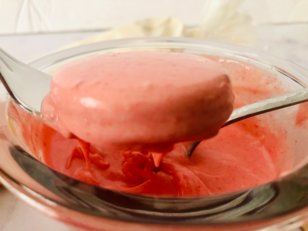 Melt white chocolate and food coloring with a little bit of coconut oil to thin it out for dipping .