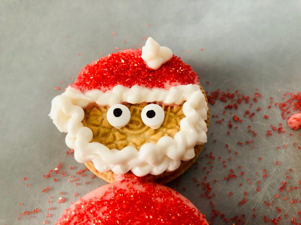 Decorate the ¼ dipped cookie with the frosting at the base of the hat and a ball on top – also pipe on the beard – add two dots of frosting and attach they sugar eyes.