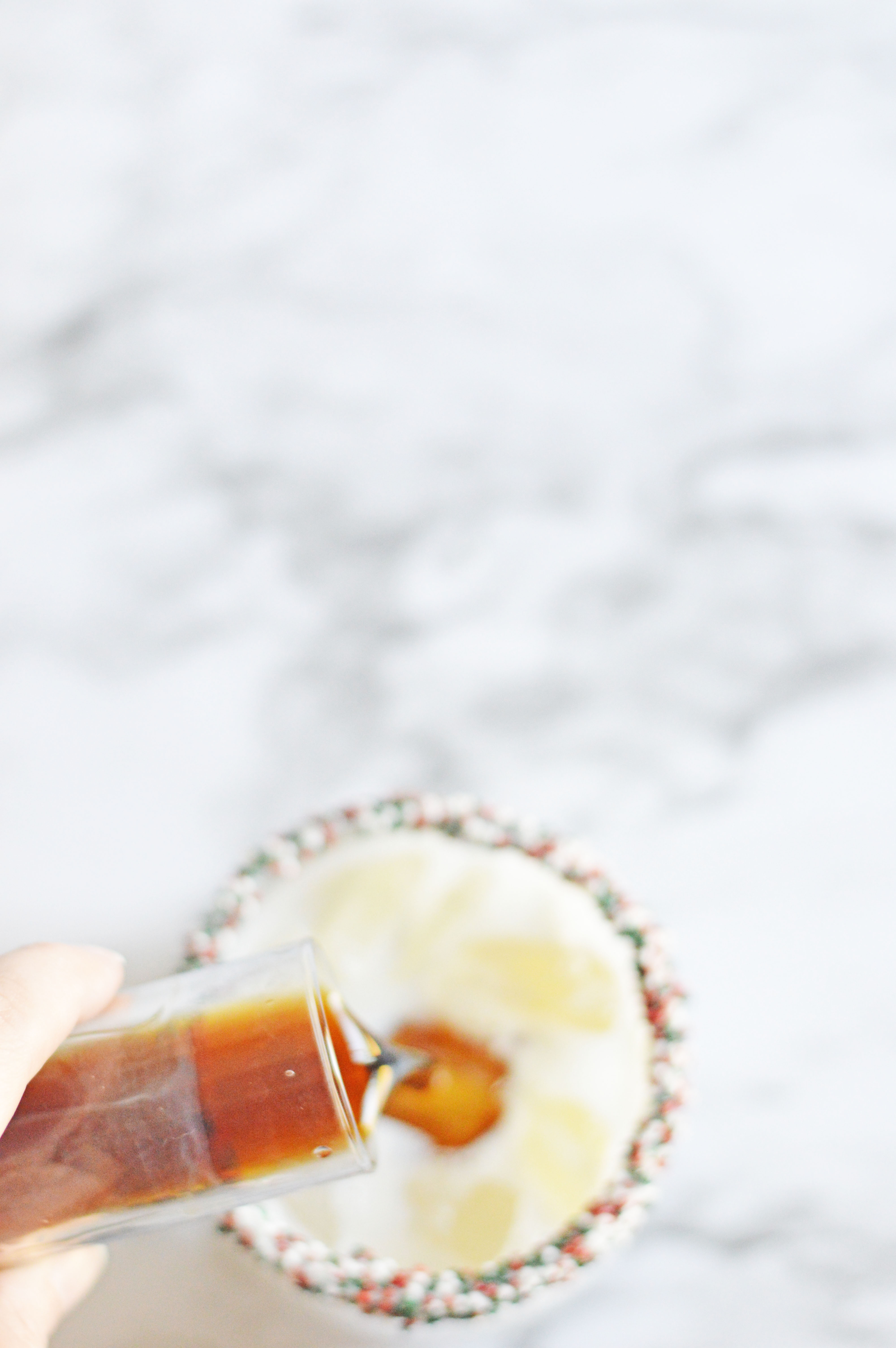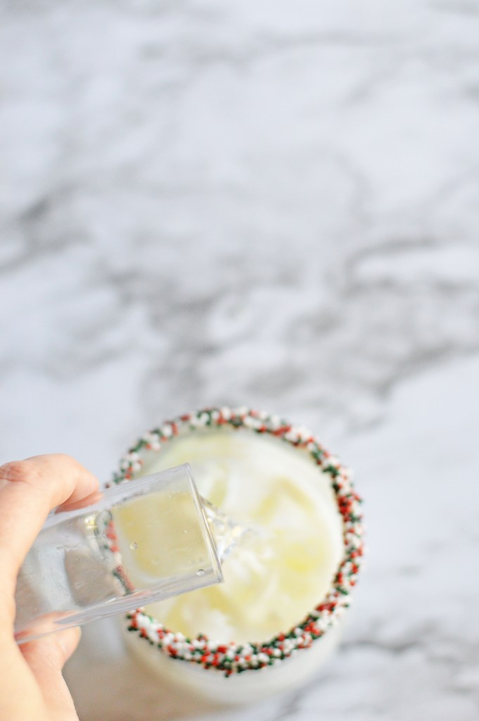 To rim the glass, add a layer of Christmas sprinkles to a saucer.