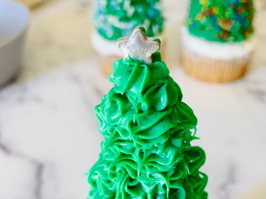 Use the green frosting to cover the sugar cones using the star tip, leave the tip of the cone unfrosted until you place it on top of the cupcake