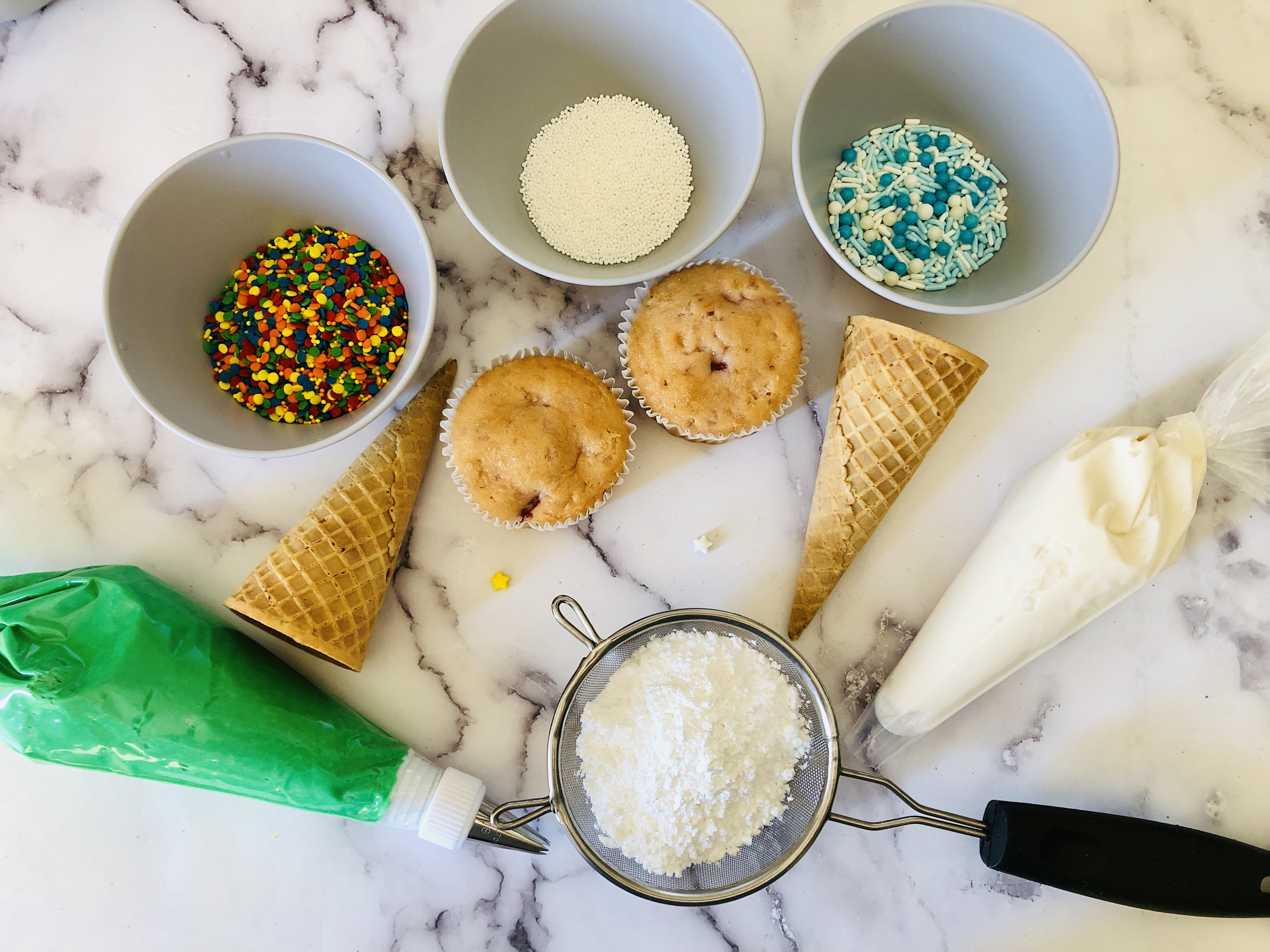 Place the cone on top of the cupcake and frost the tip and apply additional sprinkles, then place the star sprinkle on top