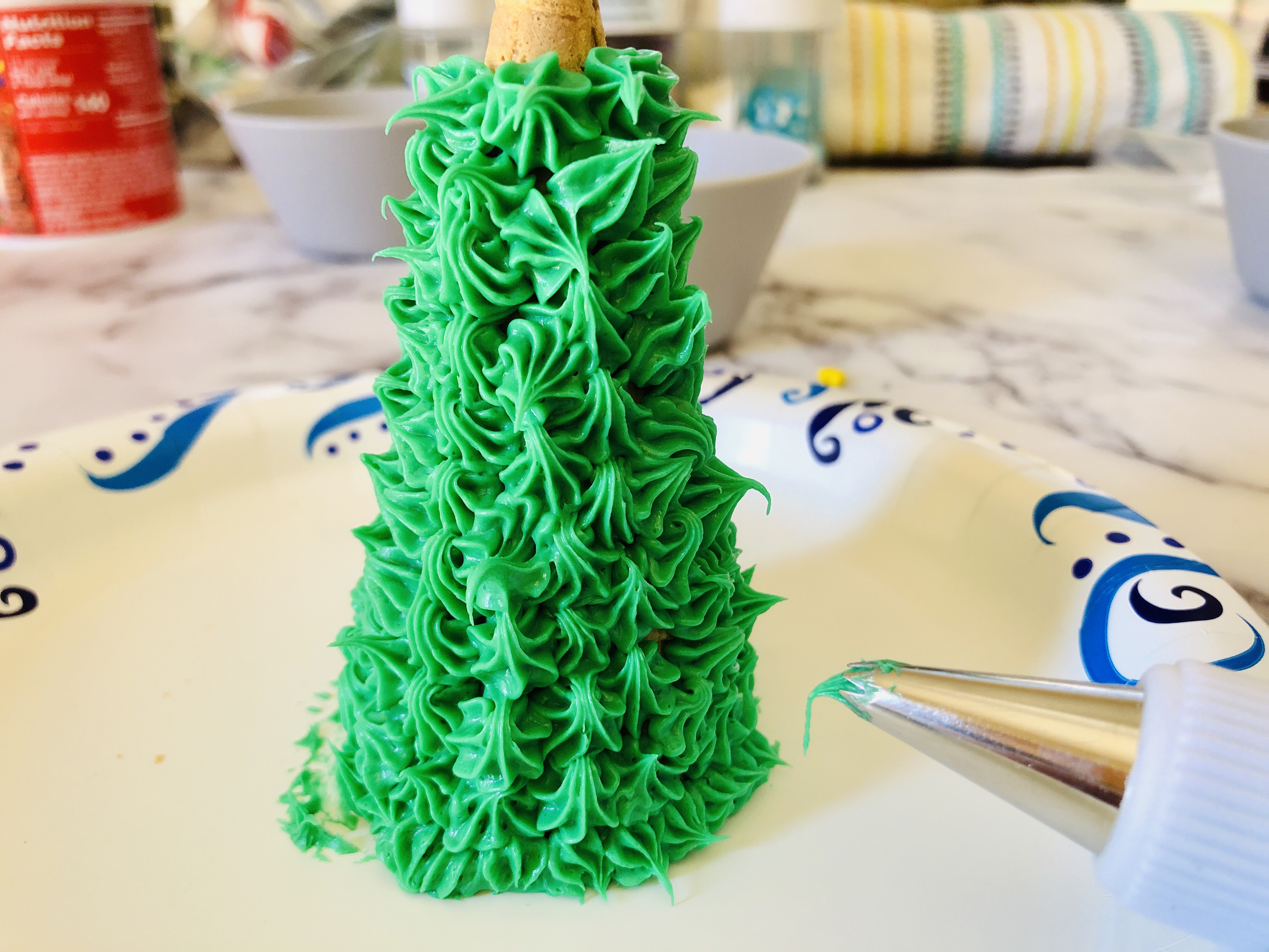 Use the green frosting to cover the sugar cones using the star tip, leave the tip of the cone unfrosted until you place it on top of the cupcake