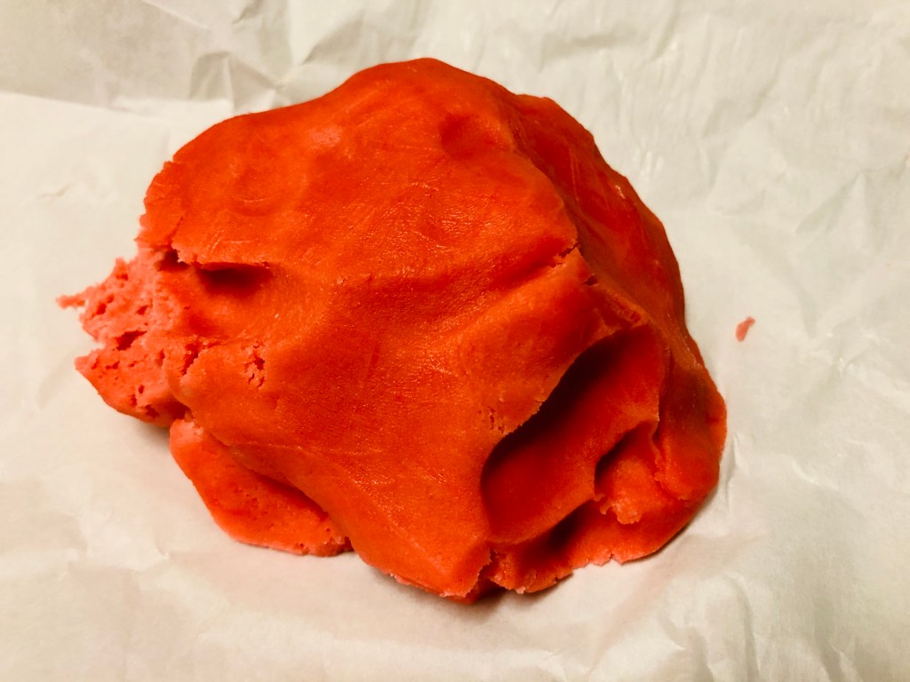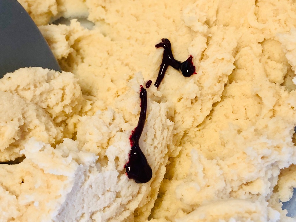 Divide the dough in 2 pieces and add stir in food coloring to one of the pieces until well combined