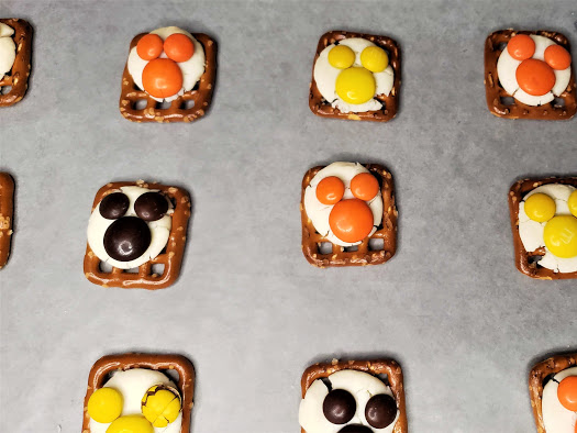 Pull the cookie sheet out of the oven and immediately start place a regular M & M onto the candy melt (Place M side down)