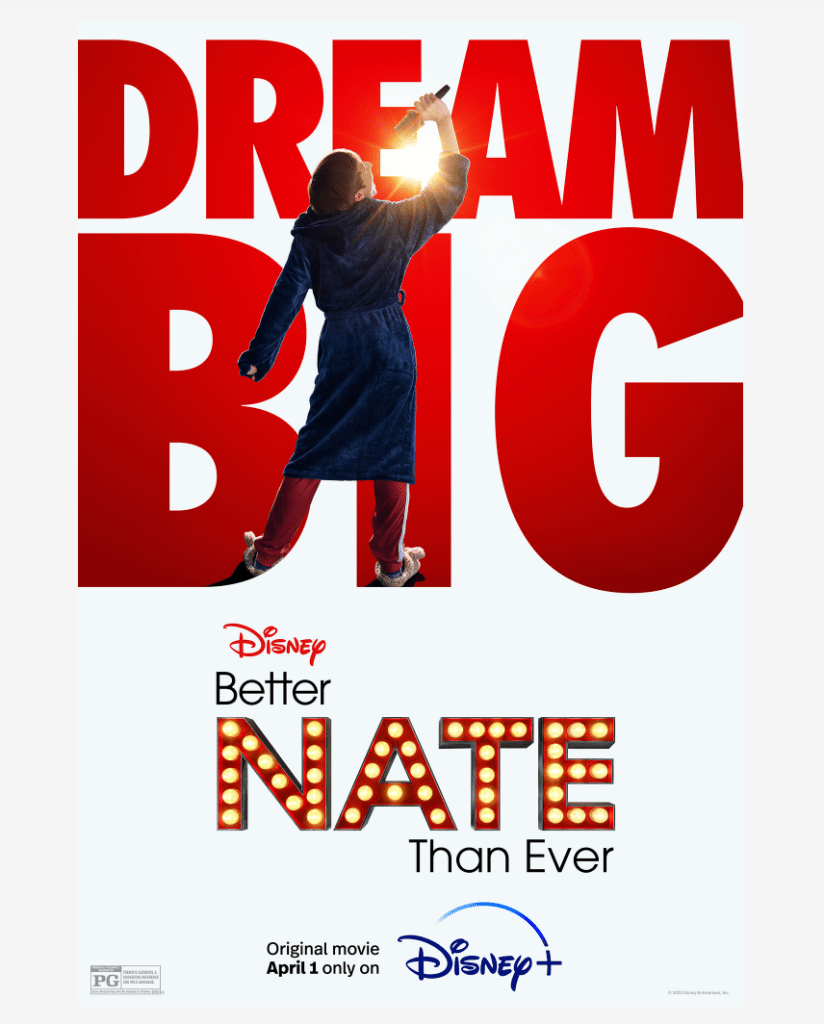 Disney+ has released the trailer, teaser poster and stills for Disney’s “Better Nate Than Ever,” a feel-good comedy adventure with showstopping musical numbers, which will debut exclusively on the streaming service April 1. The trailer features two new original songs written for the film, “Big Time,” sung by Rueby Wood, who stars as Nate in the film, and “#GoAwf,” sung by Aria Brooks, who stars as Libby, and Rueby Wood.
