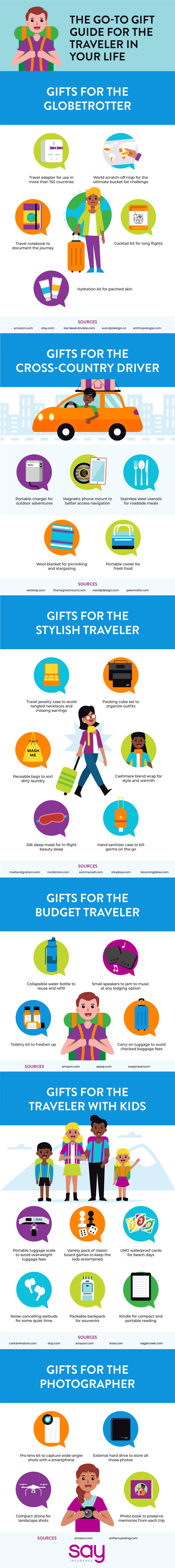 There are plenty of other types of travelers out there, too, so consider whether your friend or loved one makes style a priority when they’re on vacation, if they tend to do what they can to save a few dollars and stick to a budget, if they travel with children, or if they pride themselves on their travel photography. The more you know about the recipient, the easier it’ll be to choose a travel gift they’ll love, like the ones in this graphic!