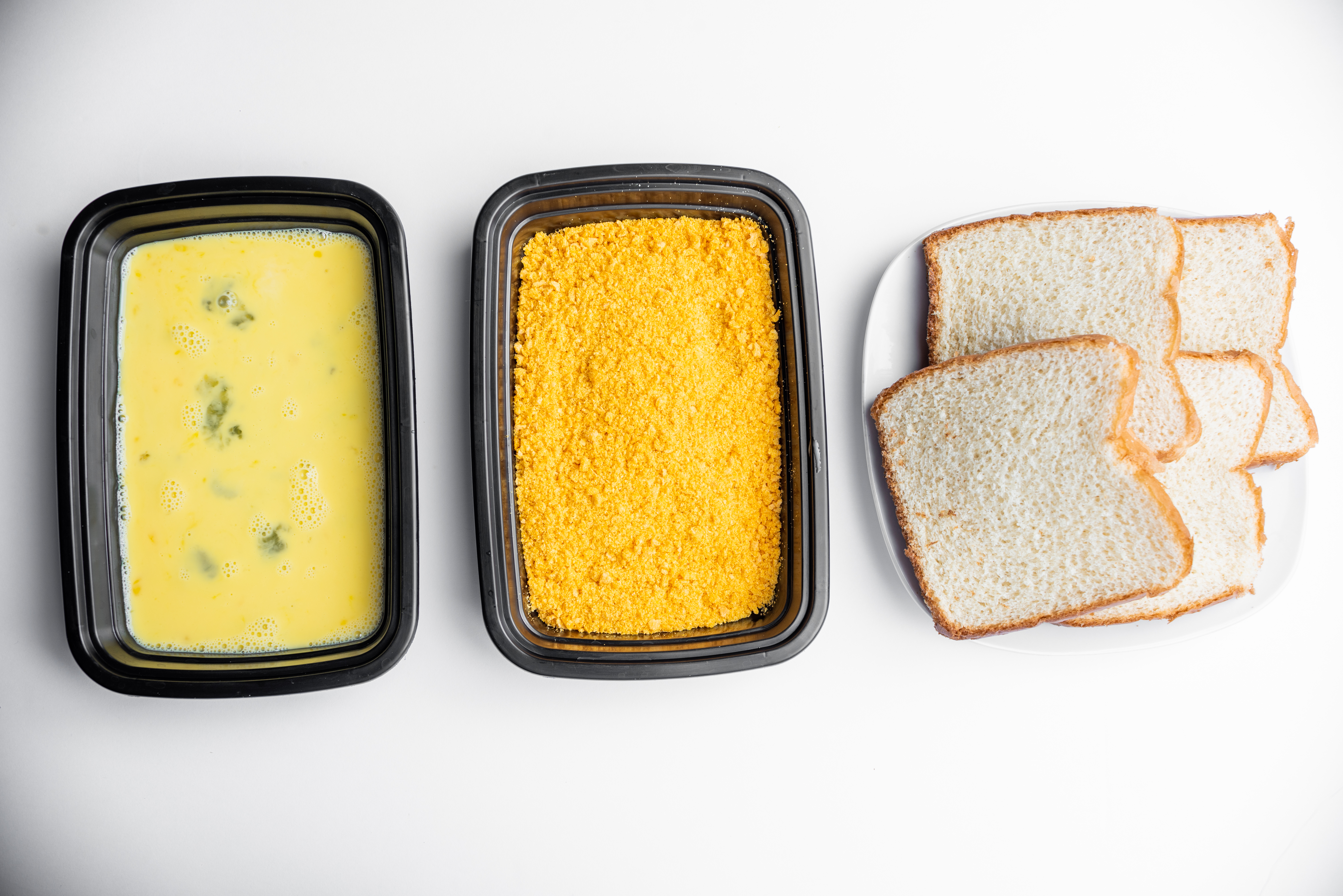 Whisk your eggs and milk in a medium sized bowl until completely blended. In a food processor (or in a ziplock bag and crumble up as much as you can) grind the cereal until it has the consistency of coarse salt.