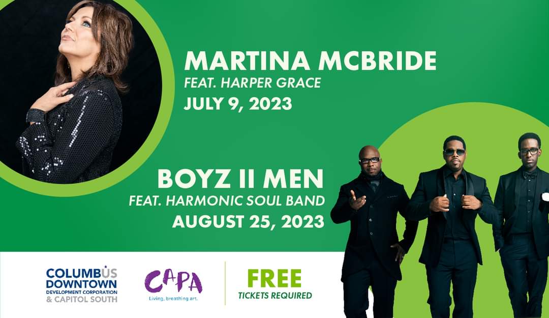Martina McBride and Boyz II Men are performing at the Columbus Commons in July and August, respectively. While the concerts are free, fans will need tickets to attend the performances.